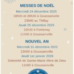 Horaires des messes du mois d’août : à Goussainville, dimanche messe unique à 10h30 / du lundi au vendredi, 19h / samedi 9h. Pas de messes au Thillay et à Fontenay